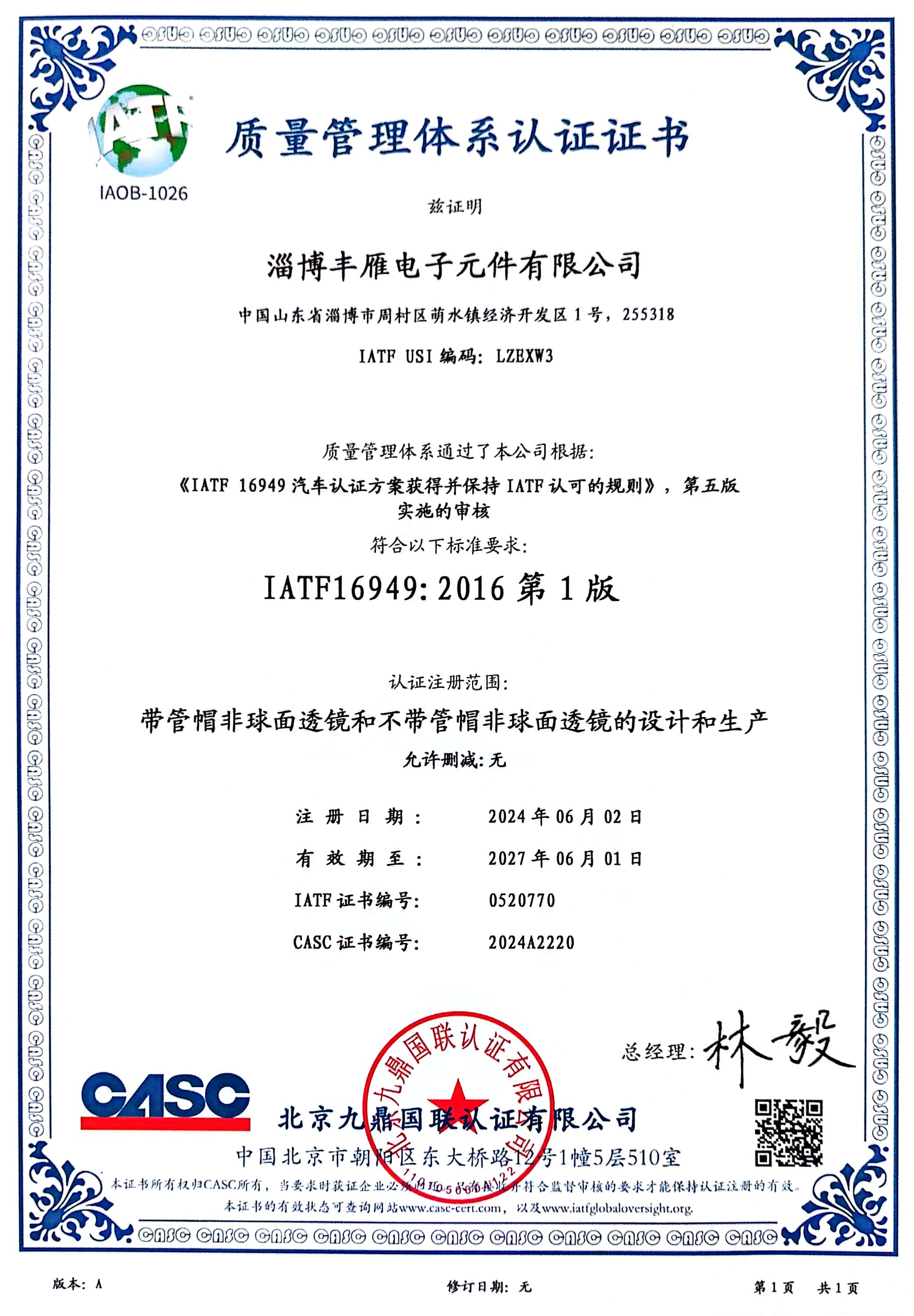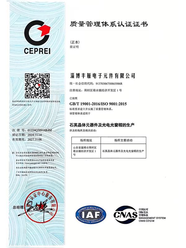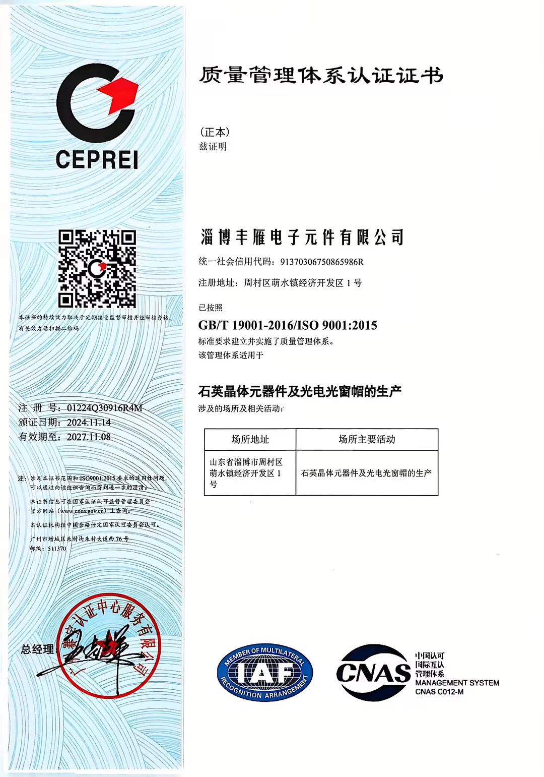 淄博豐雁電子元件有限公司,是一家集研發(fā)、生產、銷售為一體的透鏡管帽、晶體諧振器、晶體濾波器的高新技術企業。成立于1992年,坐落于山東省淄博市周村區,注冊資金1000萬元,擁有職工150余人,公司占地35000平方米,其中擁有5000平方的超凈化廠房,并配備了千級凈化工作臺,確保環(huán)境的凈化度。公司下設光電事業部,濾波器事業部,晶體事業部等多個事業部。專注為光通訊、激光器領域以及各種電子應用領域進行電子元件配套。公司于1999年通過了ISO9000質量體系認證,公司提供的所有產品符合歐盟的R0HS和REACH標準。公司被認定為淄博市“專精特新”企業、“淄博市企業技術中心”、省級“專精特新”企業、“山東省制造業單項冠軍”。公司擁有持續(xù)創(chuàng)新的研發(fā)團隊,有常年的外聘技術專家長期指導,并且與國內多所大學和光電研究所保持長期合作關系,確保了產品和技術的先進性,能持續(xù)為客戶提供高質量的產品和更好的全方位服務。
